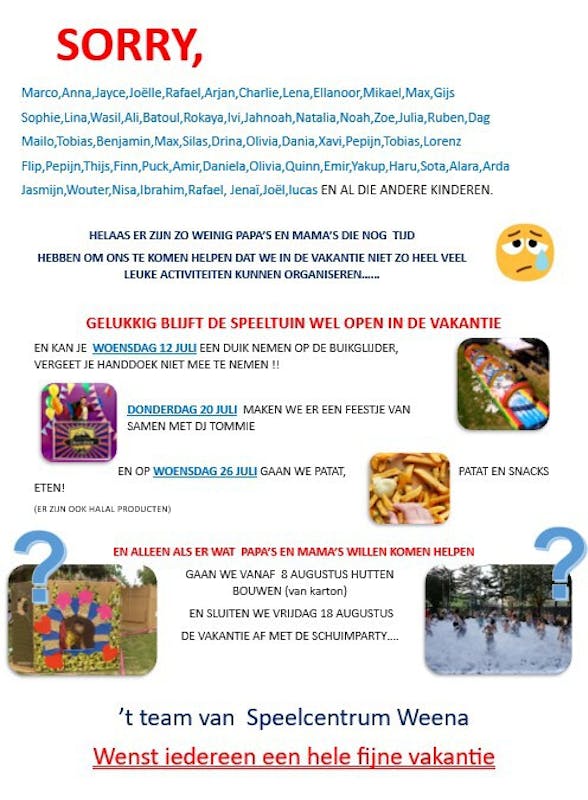 Ook als je geen papa of mama bent, benn je vann harte welkom om te komen helpen bij Speelcentrum Weena om de kids een onvergetelijke zomer te geven. Geef jij ons een beetje van jouw tijd?