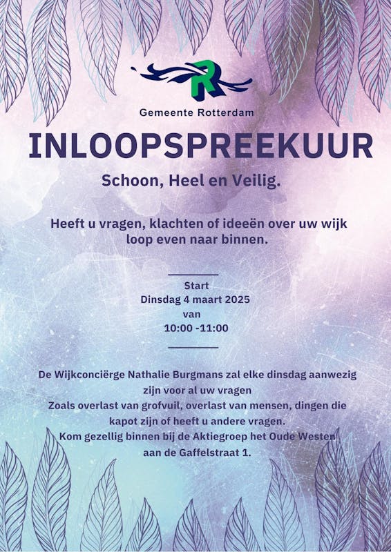 De wijkcongiërge van Gemeente Rotterdam Nathalie Burgmans zal elke dinsdag aanwezig zijn voor al uw vragen. Zoals overlast van grofvuil, overlast van mensen, dingen die kapot zijn of heeft u andere vragen? Kom gezellig binnen bij de Aktiegroep Het Oude Westen, aan de Gaffelstraat 1.