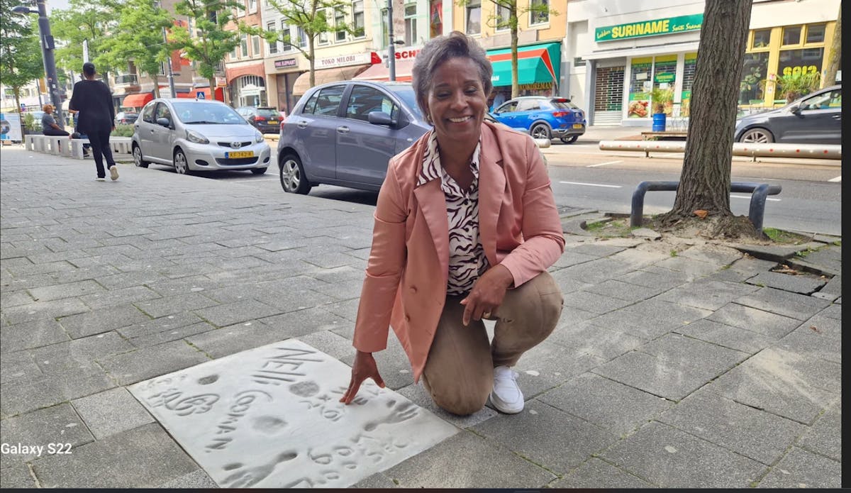 Rotterdam - Op de West-Kruiskade, in het trottoir bij verpleeghuis De Leeuwenhoek, is donderdag een eerbetoon onthuld aan Nelli Cooman. Het is een tegel uit de Rotterdamse Walk of Fame met de hand- en spikesafdrukken van de ex-atlete, die opgroeide in het Oude Westen en er nog geregeld komt.