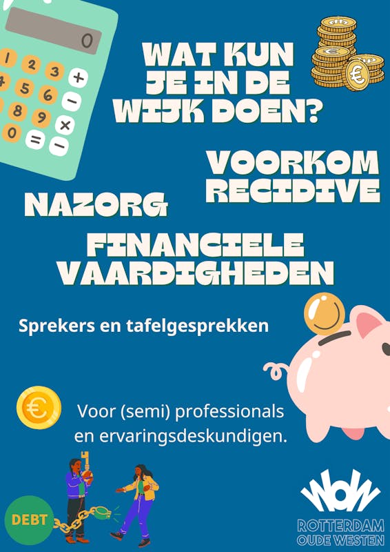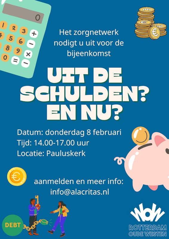 Graag nodigen we jullie uit voor weer een themabijeenkomst van het zorgnetwerk Oude Westen. Het thema dit keer is ‘Uit de schulden? En nu?’. Het komt nog te vaak voor dat mensen toch weer snel opnieuw in schuldhulpverlening terecht komen. De nazorg blijkt in de praktijk meestal niet goed uit de verf te komen. In het traject zit te weinig stabilisering, de mensen leren te weinig plannen en vooruitdenken. Op die punten zijn ze meestal niet vaardiger geworden. Om die vaardigheid te bereiken is meestal een langer traject nodig. Het eigenlijke werk van de schuldsanering is meestal voor hen gedaan en niet door hen. Wat zouden wij als wijk hierin kunnen betekenen?