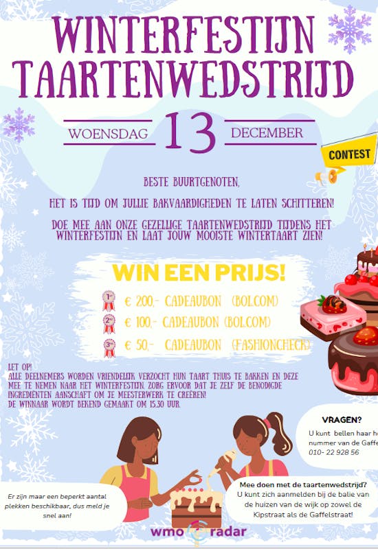 En ben je een echte keukenprins(es)? Bak dan je lekkerste taart en wie weet, win jij wel de taartenwedstrijd. Om 15.30 uur worden de winnaars bekend gemaakt.