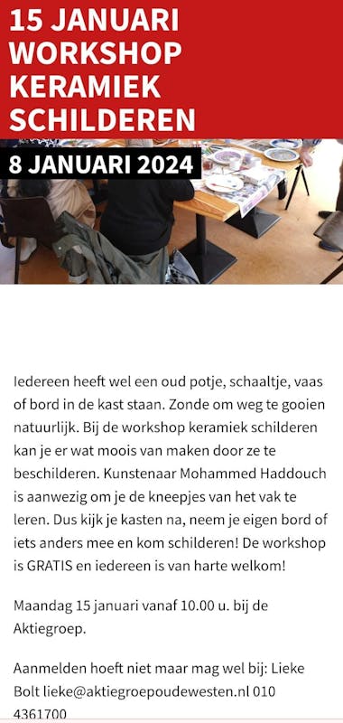 Heb je ook nog een oude vaas, bord, schaal, kopje of zoiets in je kast staan dat je nooit meer gebruikt en ook zonde vindt om weg te gooien? π½ππ Kom dan naar de Workshop Keramiek Schilderen en maak er wat moois van! Aanstaande Maandag bij de Werkplaats Duurzaam van Aktiegroep, Gaffelstraat 1-3 vanaf 10.00 u. met begeleiding van kunstenaar Mohamed Haddouch. Opgeven hoeft niet, maar kan wel bij Lieke:
